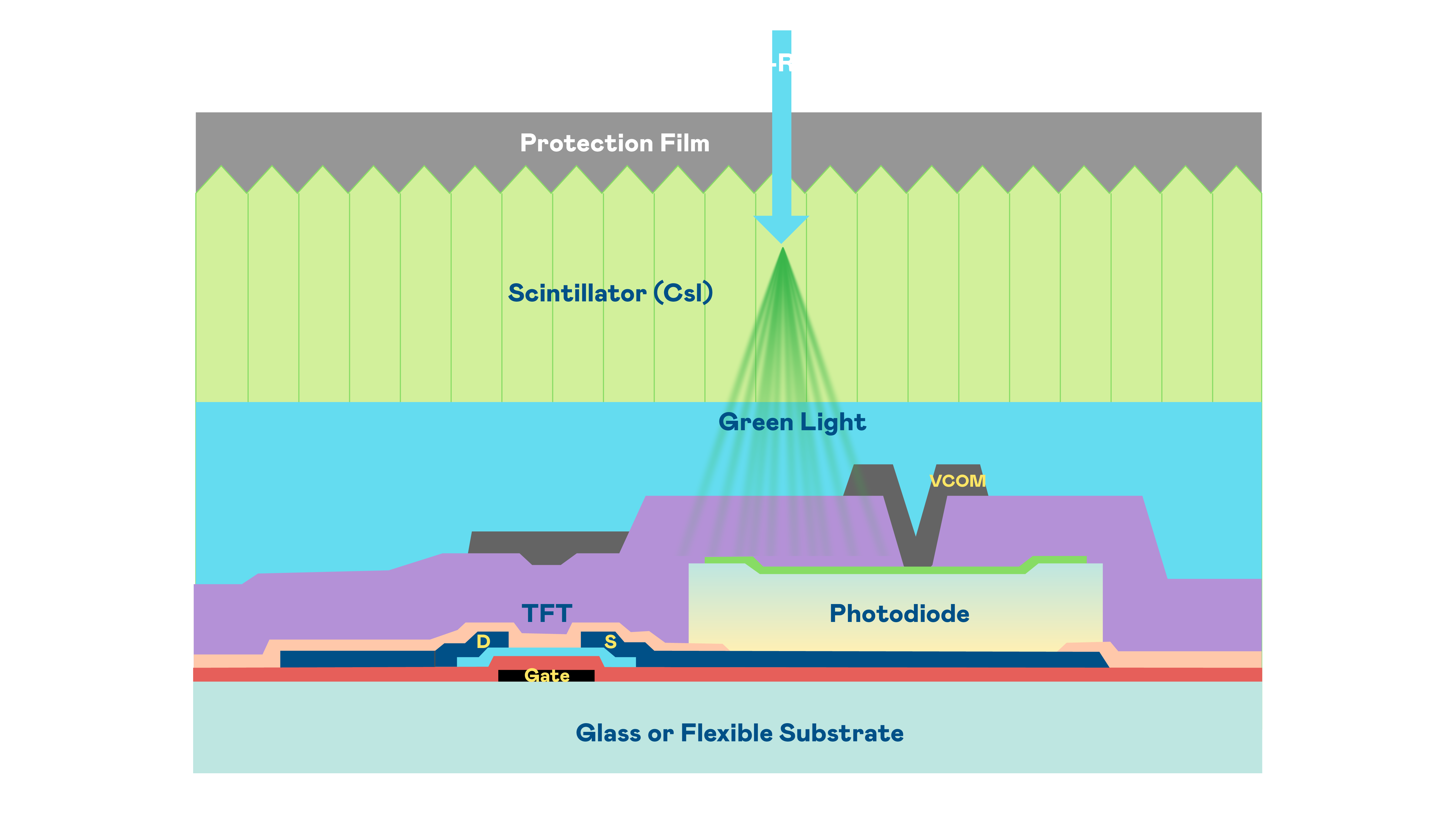 CQ9电子的X光影像感测阵列使用薄膜电晶体 (TFT) 作为每个像素的读取开关,搭配光电二极体(Photodiode)的光电转换元件,用以感测X光影像讯号。